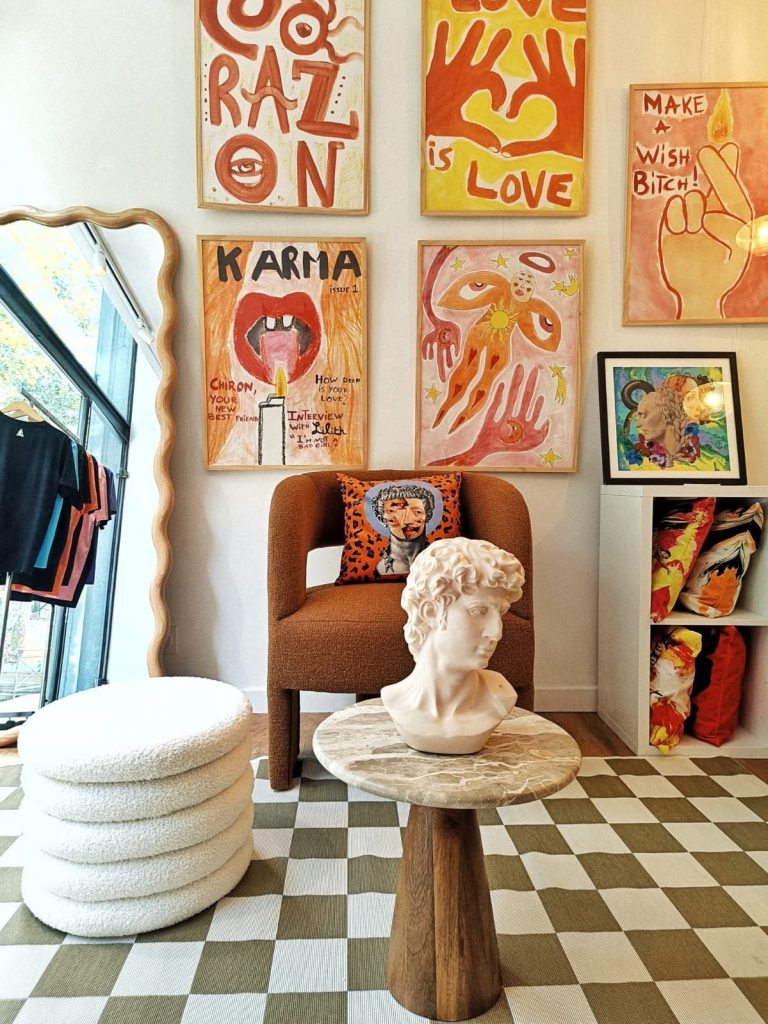 La vitrine donne d’emblée envie d’entrer dans cet univers psyché-féérique. Ici, décoration, rituels du quotidien et spiritualité se répondent. L’espace, pensé comme un véritable cocon, révèle une collection de pièces originales : affiches réalisées sur papier beaux-arts, bougies, coussins illustrés des différents signes astrologiques, mais aussi t-shirts en coton bio aux mantras cool. On craque sur le modèle Karma, à offrir absolument à une mordue d’alignement des planètes.