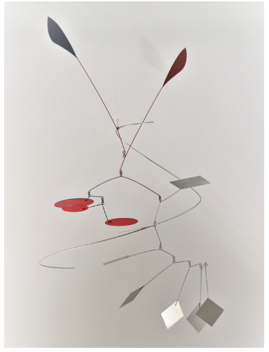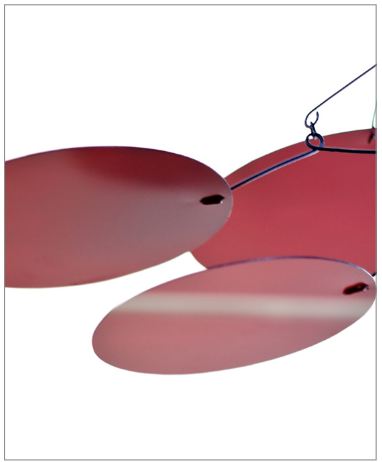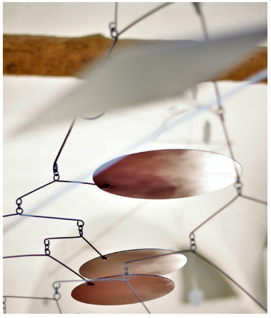 Cependant une passion, un premier amour, ça ne s’oublie pas en un claquement de doigts. Et c’est ainsi que ses premiers mobiles voient le jour. Propices à la rêverie, ses sculptures sont empreintes d’une grande poésie malgré une complexité structurale profonde. Particularité, elles sont pensées pour réagir aux souffles du vent. On retrouve dans ses travaux les paysages de son enfance faits de coquillages, d’arbres et de rochers…