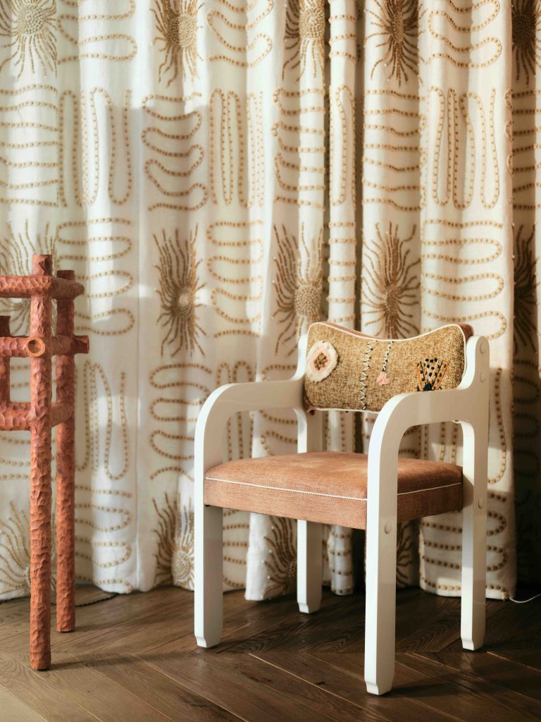 De Gabrielle Chanel à Jean-François Piège, Dorothée Delaye adapte son style à chaque projet. Appartement privé rue Saint-Honoré, maisons de collection, hôtels en France et à l’étranger, un même principe : « À Bandol, je parle de mer. À Noailles, de mixité. À Marrakech, de décadence à la Saint Laurent ! » Céramistes, ferronniers, tapissiers… l’artisanat est au cœur de son processus créatif : « Je découvre les artisans sur mes chantiers. Je les teste, je les intègre. Diane Fekete a réalisé les plateaux céramiques de la table Levant. Carlès & Demarquet ont fabriqué mes chevets pour Bandol. » Une démarche collective qui nourrit aussi son mobilier d’édition. Visuellement, elle puise dans le cinéma, la littérature et les voyages : « Je fais des arrêts sur image mentaux. Instagram lisse tout. Moi, je préfère les archives, la mémoire. » Les projets s’enchaînent. En 2026, elle inaugurera un hôtel festif à Marrakech (Le Cabestan, très Saint Laurent dans l’âme), un 5 étoiles à La Baule (Les Cimes Bleues) et ajoutera à son book une collaboration avec Monoprix, pour Noël.