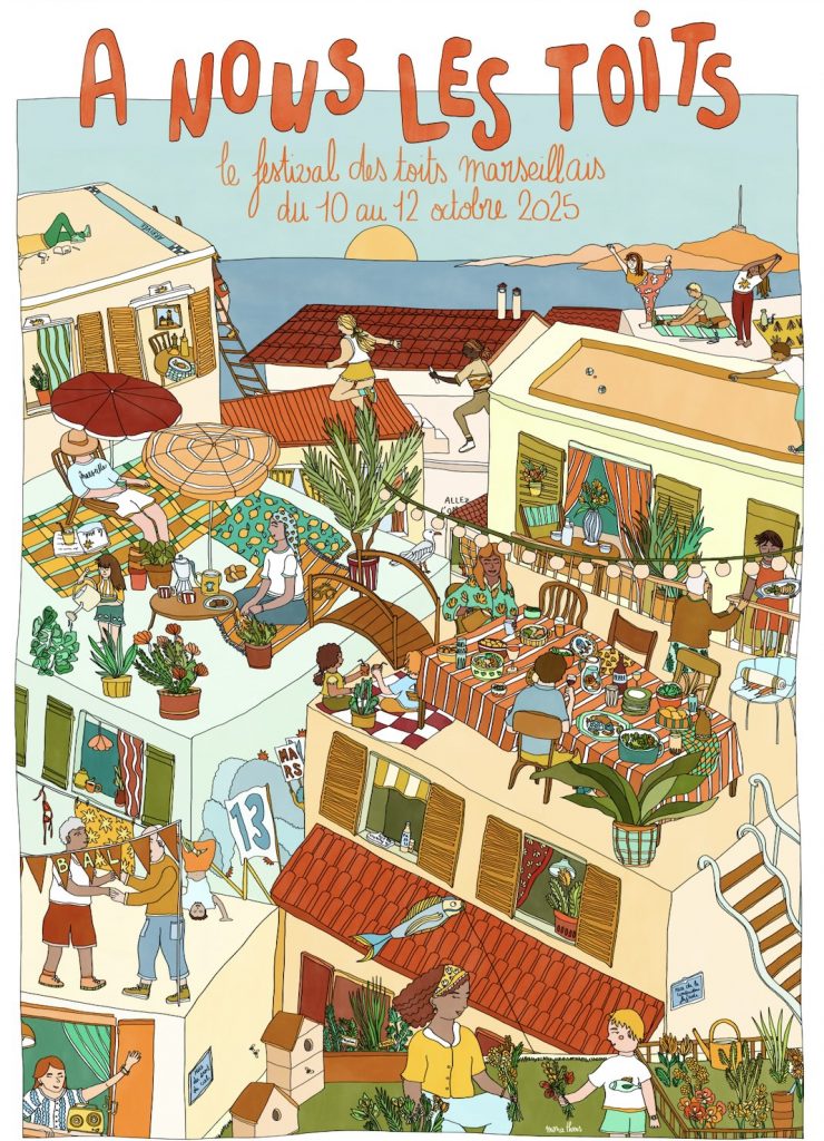 Du 10 au 12 octobre, Marseille se redessine à hauteur de ciel avec À nous les toits ! un festival urbain que l’on aime retrouver chaque année depuis 4 ans. Initié par le collectif Marseille Solutions, l’événement invite habitants et curieux à (re)découvrir les toits de la ville comme des lieux de vie, d’échange et de fête. Cette 4ᵉ édition explore une quinzaine de toits emblématiques, souvent fermés au public, pour imaginer ensemble de nouveaux usages : culturels, sociaux ou écologiques.