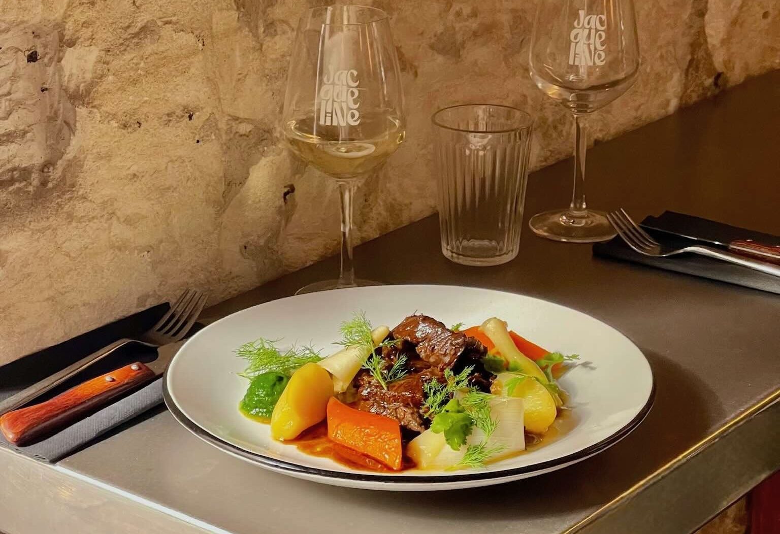 Le Bistrot Saint-Jacques a laissé place à Jacqueline, un repaire gourmand intimiste et chaleureux, remis au goût du jour par l’architecte d’intérieur Delphine Sauvaget. L’ambiance évoque désormais un bistrot new-yorkais où l’on déjeune coude à coude au comptoir, idéal pour provoquer des rencontres. En cuisine, la cheffe Marion Delfaud (ex-sous-cheffe chez Bouche, Paris 11ᵉ, et chez Regain, Marseille 5ᵉ) signe une carte courte, instinctive, en parfaite harmonie avec la saisonnalité. Sa cuisine créative se distingue par des assiettes raffinées, gourmandes et subtilement épicées, héritage assumé de ses origines réunionnaises. À l’heure du déjeuner, Jacqueline séduit ses hôtes avec une formule au rapport qualité-prix imbattable, 20 € entrée-plat ou 24 € entrée-plat-dessert. En entrée, les poireaux grillés et leur œuf confit, relevés de cumin, citron et yaourt, font mouche. Original à souhait. Pour le plat de résistance, êtes-vous plutôt ragoût de poulpe aux lentilles ou pâtes au persil et brocolis, nappées d’une sauce vierge au céleri ? Pour accompagner le tout, la carte des vins, en constante évolution, ravira les fins palais. Le soir venu, Jacqueline revêt ses habits de feu ! Les lumières s’adoucissent, le son monte, l’ambiance s’électrise et l’on se surprend même à danser sur les tables… À chacun son moment chez Jacqueline. LP