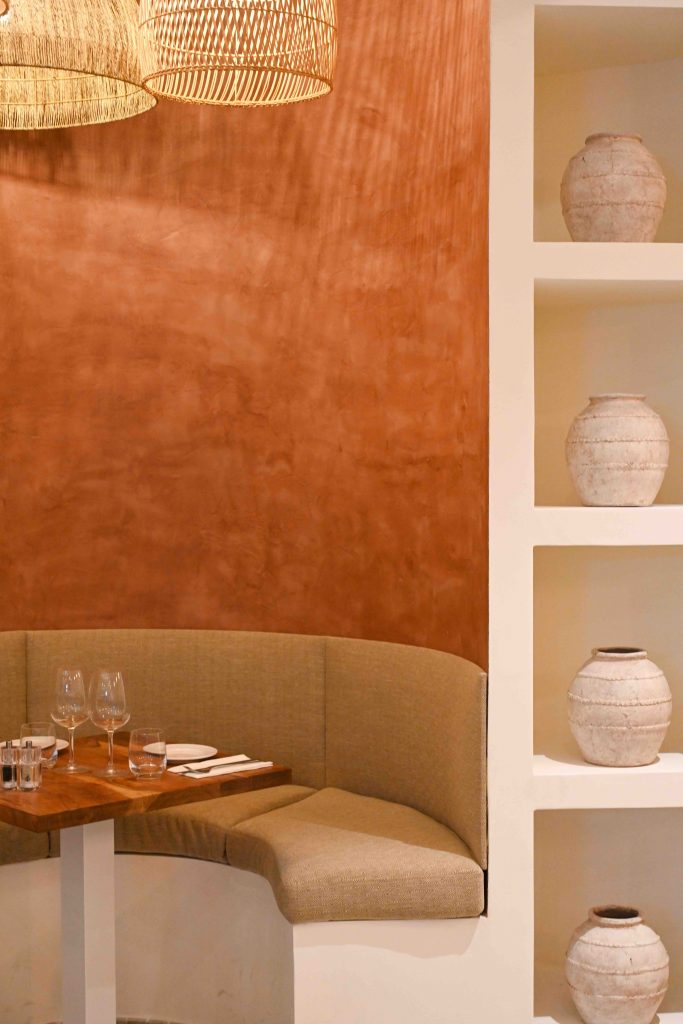 En salle, on repère d’emblée les appliques d’Enamoura et on aime les chaises en osier. Dans l’assiette, les Cyclades s’offrent à nous : une cuisine fraîche, simple et généreuse, pensée pour circuler librement au centre de la table. On aime aussi la tablée intimiste à l’étage, idéale pour l’entre soi.