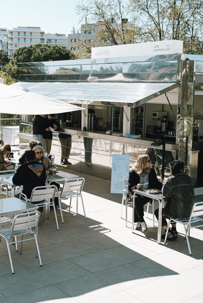 Sur le toit du MAC, trois associés marseillais ouvrent un café branché dans le quartier très résidentiel de Bonneveine. Chacun y va de son talent ! Joe Abi Karam, entrepreneur du transport et du mouvement, contribue à la rigueur ingénieuse du lieu. Alex Doré, formé au métier de barista en Australie, compose une carte modulable. Au menu, des salades de saison et de généreux sandwiches comme ce Beef Club savoureux (bœuf effiloché cuisson lente) ou encore un gourmand Chicken Chipotle. On peut aussi se régaler d’un remarquable banana bread toasté à l’heure du goûter, avec un chai latte. De son côté, Fouad Bouchoucha, artiste émérite, orchestre la vie culturelle du rooftop avec l’ambition claire de « faire une jonction avec le MAC pour démocratiser la culture. » Les prochains vernissages du musée trouveront donc naturellement leur suite sur ce toit-terrasse. L’esthétique est hyper brute, c’est full aluminium, un stylequi colle à l’univers du Musée d’Art contemporain. Cet été, le Kiosk s’animera en soirée autour de cocktails & tapas, avec une programmation musicale soignée (Olivier l’Amateur et Ludivine Dupré de Radio Grenouille sont déjà dans la boucle). Et le dimanche matin, une fois par mois, il fera place au Pilates avec Tonic sur l’esplanade ! Les idées foisonnent et le lieu de s’animer rapidement… CGR