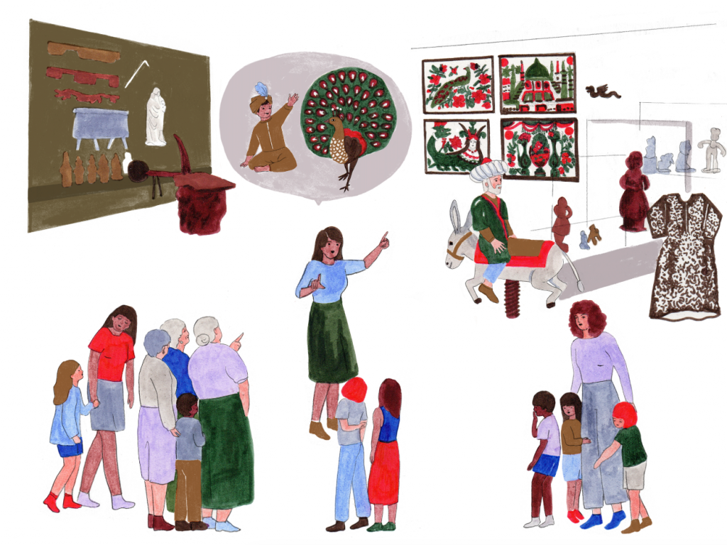 La visite contée pour les 3 à 6 ans, « Un objet, une histoire », met en avant les objets du quotidien. Le sage Nasreddine conte son récit dans un pays imaginaire d’Orient : Le paon du palais part à la conquête d’un beau cadeau pour son prince, tandis qu’il rencontre les artisans renommés de la région. On y découvre leurs créations les plus singulières. Cette parenthèse narrative est en lien avec l’exposition du moment, « Populaire ? ».