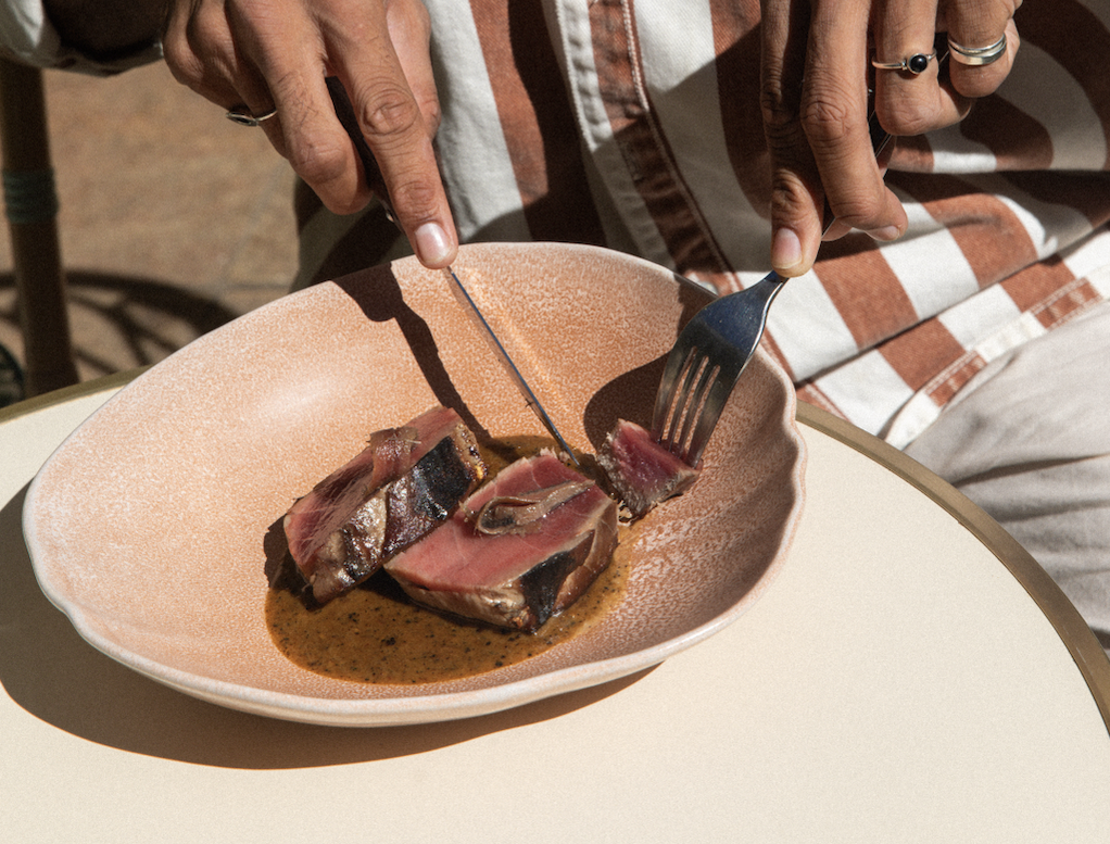 Chez Sole, pas de folklore méditerranéen : l’ambiance est brute, épurée, murs laissés apparents et cuisine ouverte. Au centre de la salle trône une chambre d’affinage transparente où les poissons maturent sans glace pendant plusieurs jours, voire des mois. Une technique inspirée de la haute gastronomie japonaise, qui sublime les chairs, en jouant sur l’hydrométrie, pour en concentrer les arômes. À la carte, crus (sashimis, crudos), cuissons au four Mibrasa à charbon, mais aussi quelques pièces carnées bien choisies, pour les irréductibles amateurs de viande. De quoi rassembler tous les appétits autour de la même table.