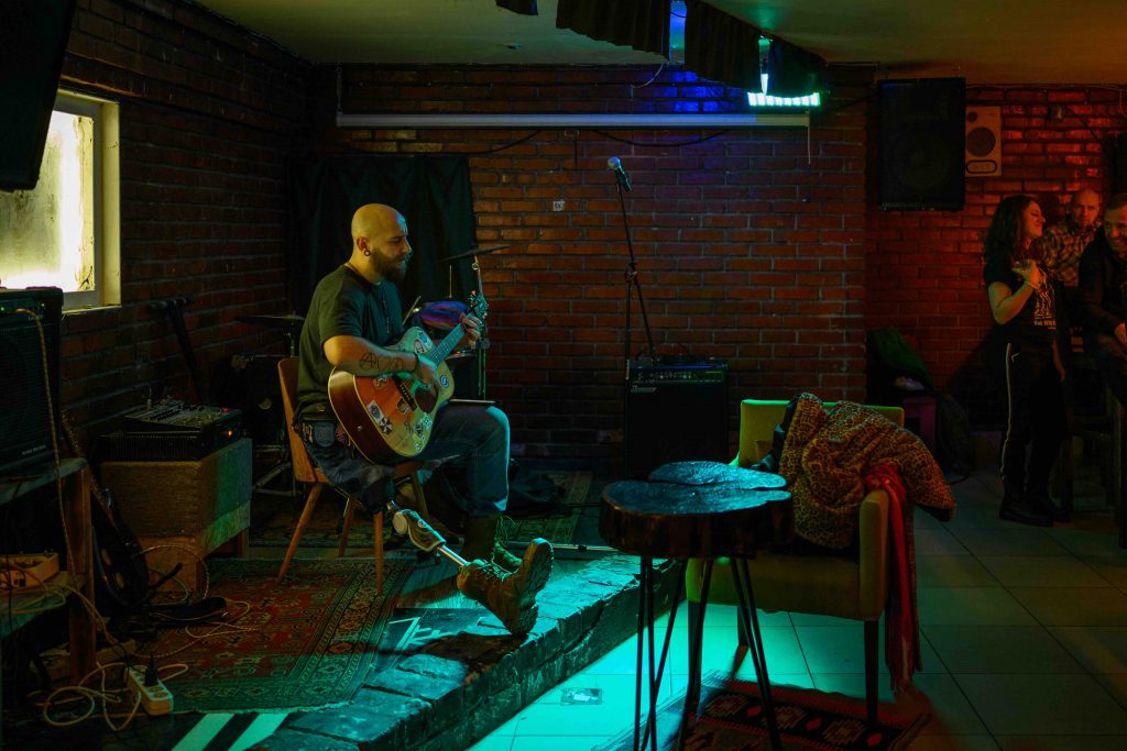 Photo 1 : Illia, 28 ans, joue de la guitare dans un bar pendant un évènement organisé pour les vétérans de la guerre en Ukraine par une organisation caritative locale, le 26 Novembre, à Kharkiv, une ville ukrainienne située à environ 30 kilomètres de la frontière russe et régulièrement frappée par des attaques aériennes.