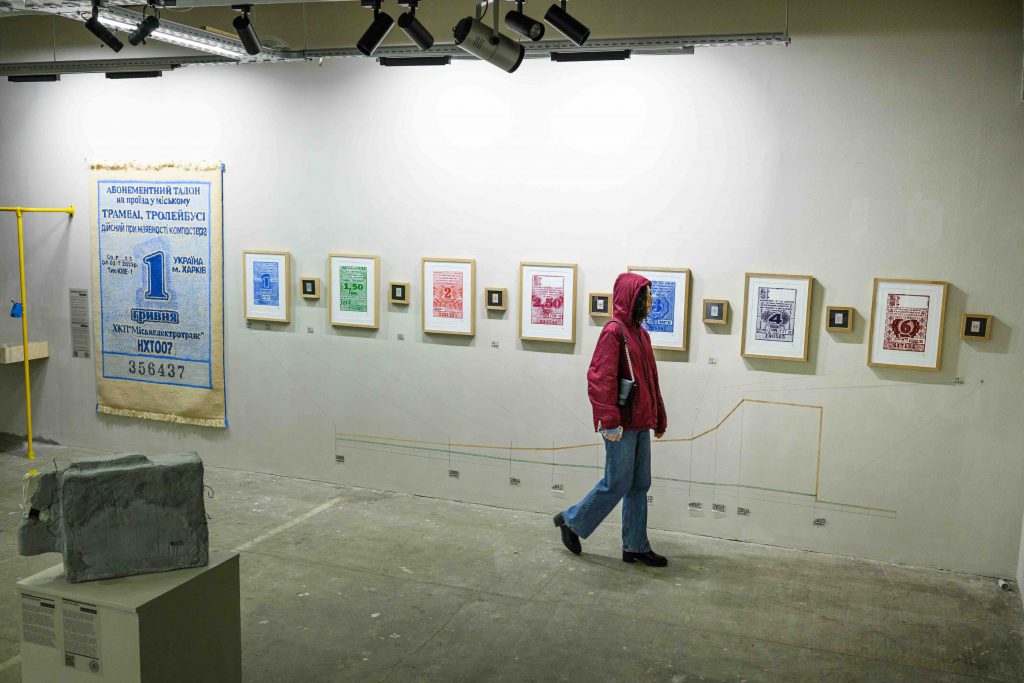 Photo 2 : Une femme visite une exposition organisée au Centre Yermilov pour l’art contemporain à Kharkiv le 30 novembre 2025.